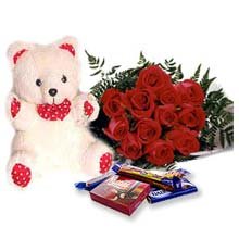 blind love with12 red roses bunch , 8" teddy ,5 Cadbury chocolates (40 grm each) |