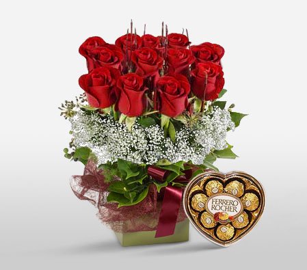 The classic symbol of love for over 400 years, these carefully selected 12 red roses along withy baby breaths are well wrapped and tied with a bright ribbon in a basket along ferrero chocolate.