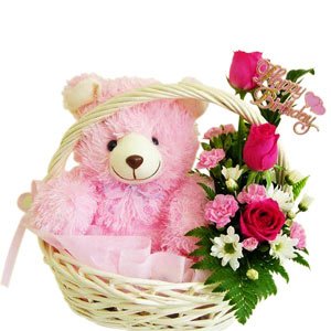Pinky ParadiseDescription Find paradise and color it pink with this exciting hamper. A pretty pink roses arrangement comes with a super cute pink Teddy bear in a basket. 3 Pink Roses With Medium 9 "Teddy Bear In Basket |
