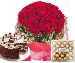 Long to see your special person once more? Let her know it by sending her these 36 of red roses with gorgeous glass vase,24 pcs ferrero rocher chocolate and chocolate torte cake. Your gift will come with a greeting card and your message.