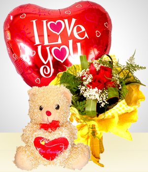 Tenderness Combo6 Roses Bouquet + Balloon + Teddy Bear "To say "Sorry," I love you "or just" I'm with you ". Super romantic offer of: -6 roses bouquet -A I LOVE YOU balloon 24 inches teddy and PIlLow -A teddy bear specially for the occasion. |