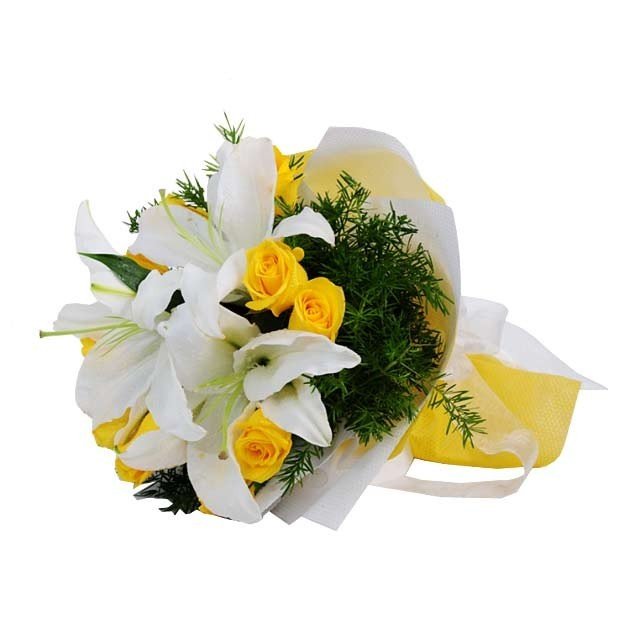 LOVELY LOVEYou cannot go wrong when you match white lilies with yellow roses for a hand bouquet. They really complement each other well. |