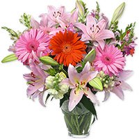 Perfect SmileA unique, exotic blend of pink lilies, gerberas, and snapdragons, placed in a pretty vase, makes a truly extravagant addition to their day.A unique, exotic blend of pink lilies, gerberas, and snapdragons, placed in a pretty vase, makes a truly extravagant addition to their day. |
