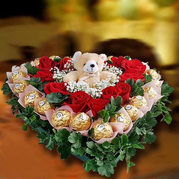 Forever LUV12 Red Roses & 24 Rochers With 8 inches Bear Love-Shape Table Arrangement |