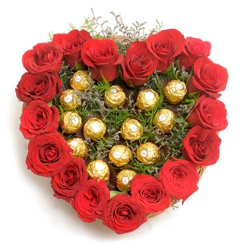 Heart Shape LoveThe Truly Yours Rose with Chocolate is a bright and beautiful way to send your love and affection across the miles!! A gorgeous heart shape arrangement to create an incredible presentation to sweep your sweetheart off their feet. The lovely heart shape arrangement is a wonderful gift that any of the loves in your love will adore. Heart shape arrangement of 24 Red Roses with 16 Pieces Ferrero rocher & Lot of green fill |
