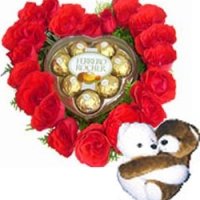 A teddyfic gift like 24 red roses in a basket with heart shape ferrero chocolate and couple bear to make your honey feel special...
