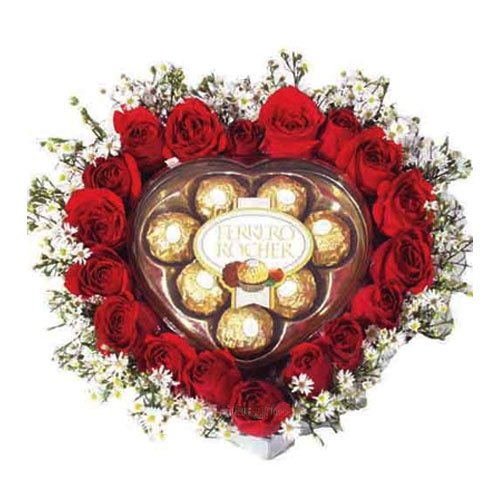 Mi AmorWho can go wrong with roses and chocolate? Why not combine them in this unique heart shaped arrangement of heart-shaped Ferrero Rocher 16 embedded in heart shaped 24 red roses. |