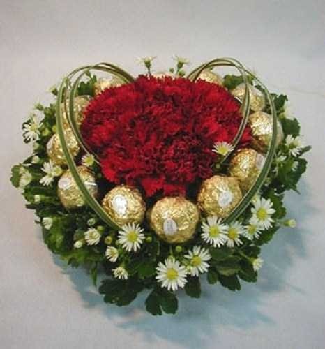 Sweet love16 ferrero ,white Malaysian and res carnation in a heart basket. |