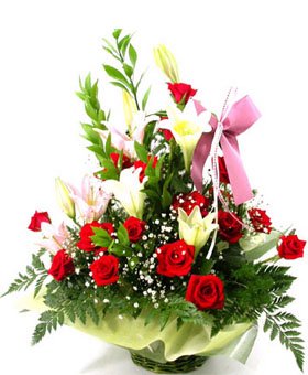 Affectionate19 red roses, 2 white lilies, 2 pink lilies, with green leaves |