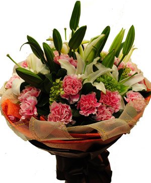 Every String3 lilies and 20 carnations match green leaves, beautiful hand-tied bouquet. |