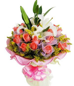 16 pink rose in independent packaging with 2 white perfume lilies, match solidago. Send round style bouquet express feelings of because I have already filled your heart, you're my whole world.