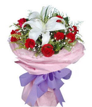 2 white lily,11 red rose. Pink hands knead paper packaging, the external screen, pink, purple butterfly finished bouquet.