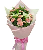 Spring BreezePink carnations 16, white(or pink) lilies 2, with green leaves fully. |