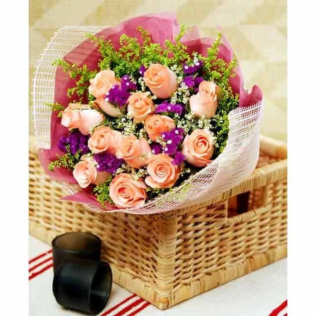 12 stalks of pink roses hand bunch with Statics and Caspia