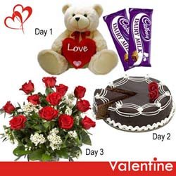 3 Days SerenadesDay 1. TWO feet tall Teddy Bear holding a heart with 2 Cadbury Dairy Milk Chocolates 65 gm each.( Dely on 12th Feb) Day 2. Mouth watering chocolate cake -500gm. ( Dely on 13 th Feb ) Day 3. Bunch of 12 Red Roses for your sweet heart. ( Dely on 14th Feb. ) Please note : Cake design n looks may vary depending upon local availability |