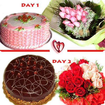 Two Days ComboSend fresh roses to your sweet valentine & express everything what you want to say. Hamper includes two days package: Day 1-feb 13 : 12 pink roses bunch with 1/2 Kg mocha cake cake design may vary DAY-2 feb14: 12 red & pink roses bunch along with 1/2 Kg chocolate cake. cake design may vary- |