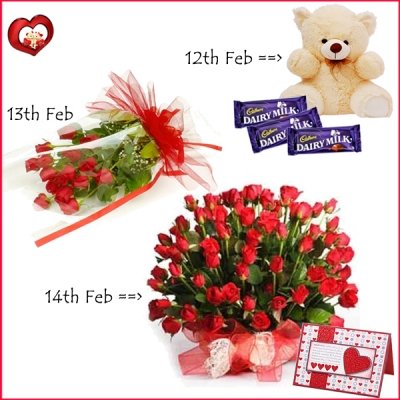 Valentine's 3 Days FantasyTo impress your loved ones send this lovely not only for one day, but its for three days which shows how much they mean for you and its simply reflect your love. This 3 Days Serenade includes : 12th Feb - A cute teddy bear (8 inches) with 3 bars of cadbury dairy milk chocolates (60 g each) 13th Feb - Bunch of 12 red roses. 14th Feb - Bunch of 24 Red Roses with a special Valentine Greeting Card. |